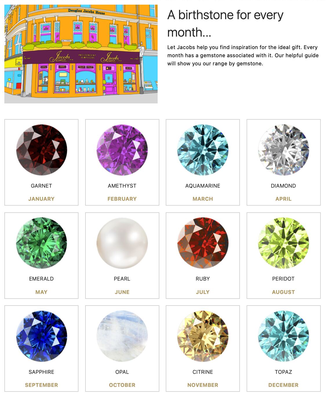 We've put together a helpful tool on our website so show you ideas related to the month of any birthday - take a look + let Jacobs show you a perfect gemstone jewellery selection!